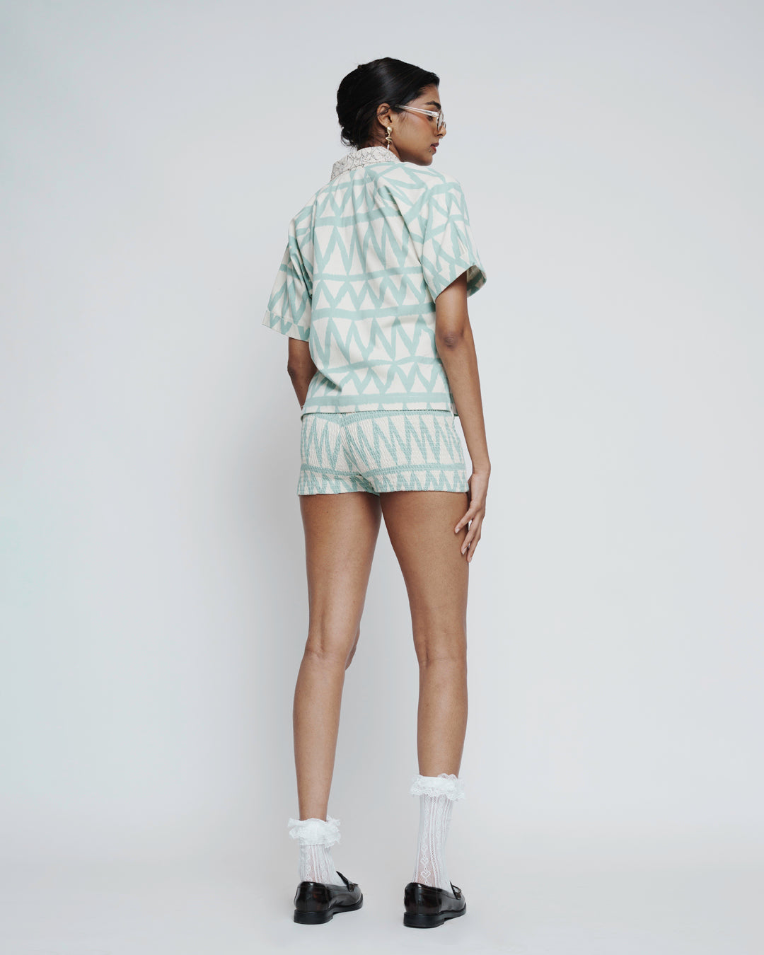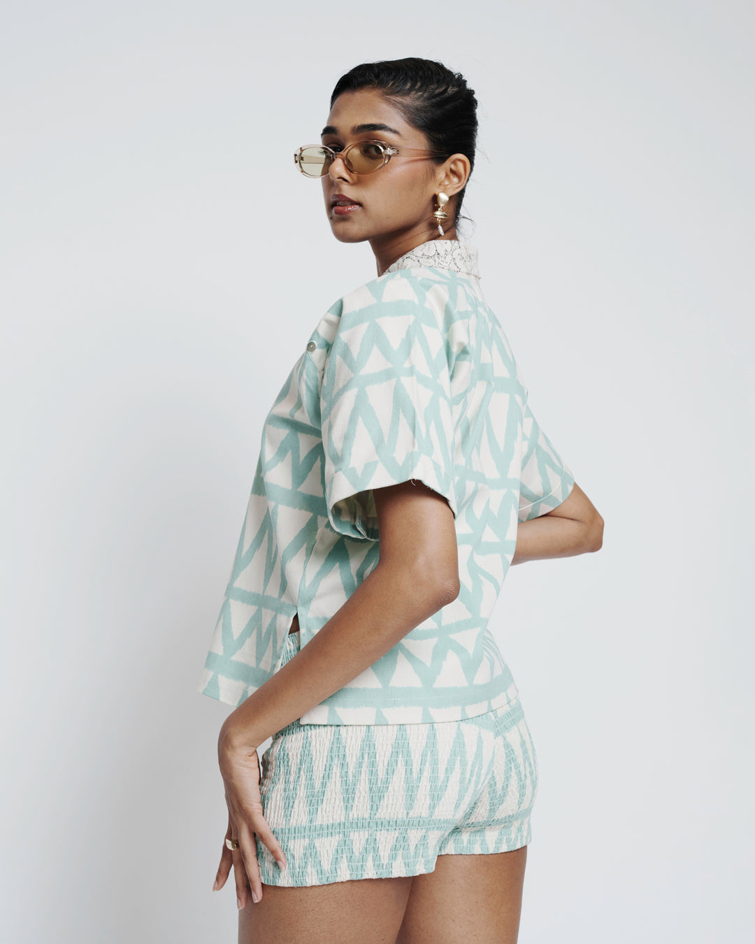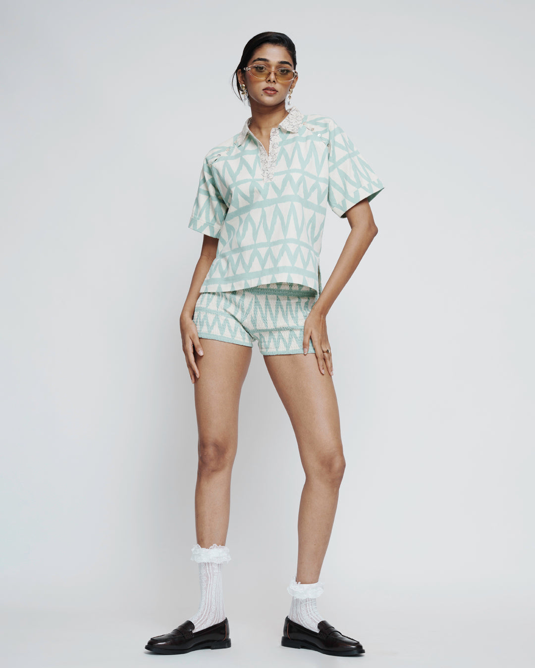 Fresh, fun and effortlessly chic set crafted in breathable cotton, features a relaxed fit button look with bold geometric print on the top, accented by a delicate lace collar. paired with high waisted smocked shorts that hugs the body just right.