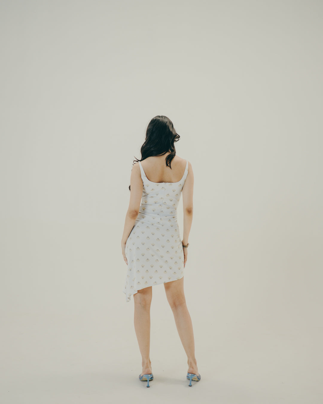 Crafted from lightweight fabric, it features a soft drape that contours effortlessly to the body. The dress is adorned with subtle motifs. A gently ruched side seam enhances the fit, while the asymmetrical hemline brings a modern, fluid silhouette.