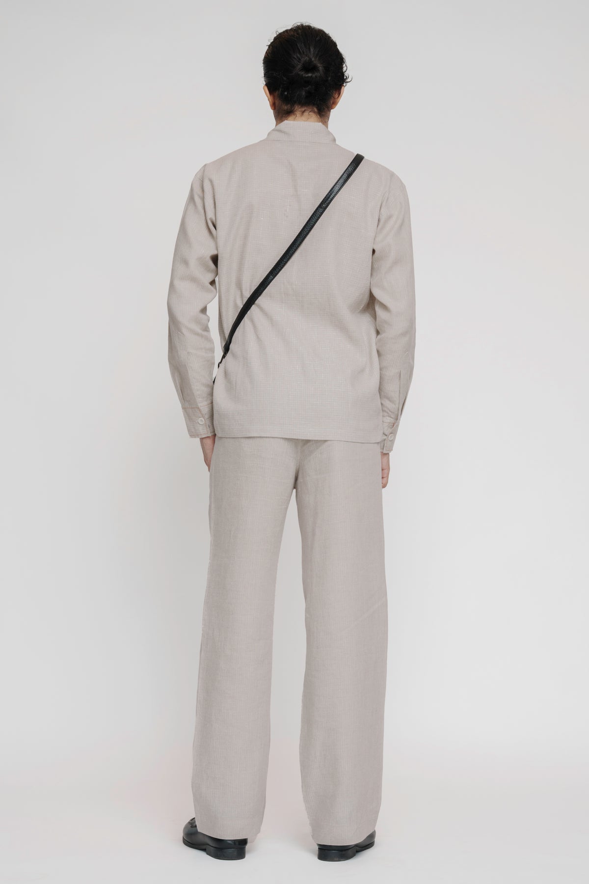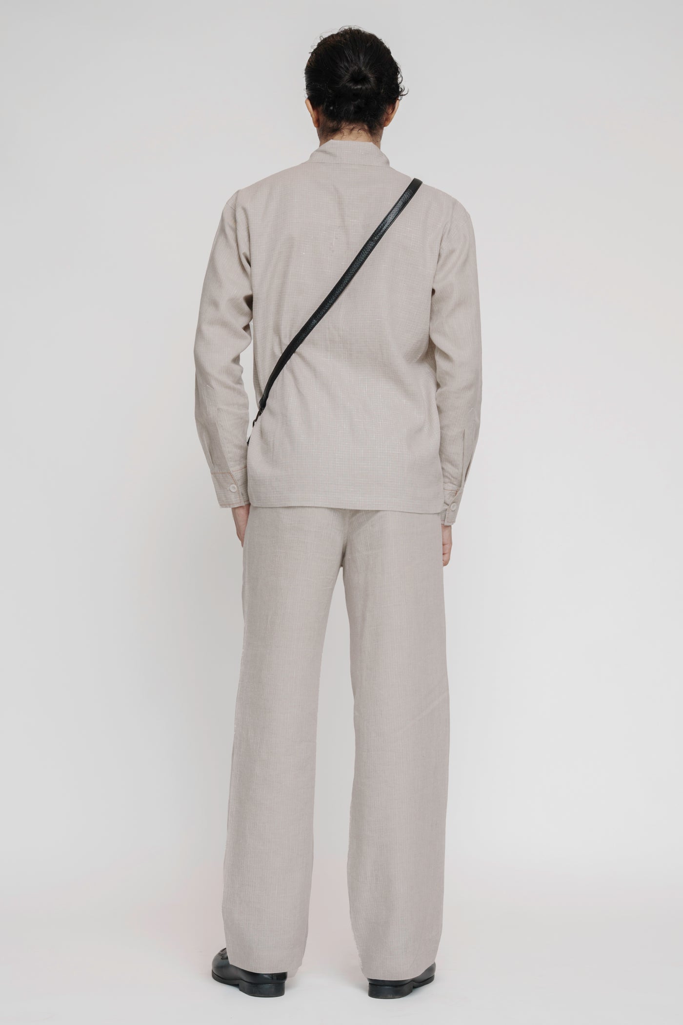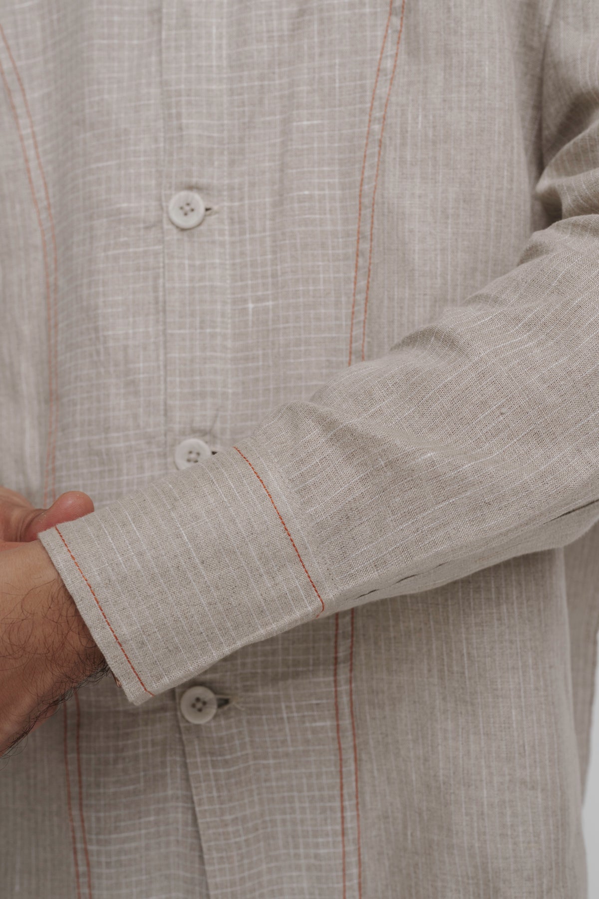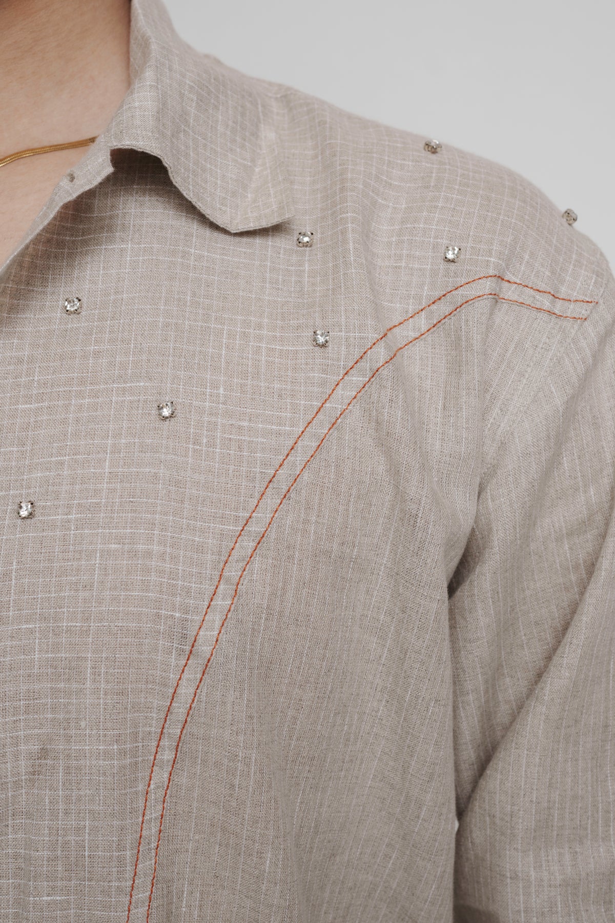 Crafted in linen, this beige shirt is definition of understated luxury. The shirt features clean button down tailoring with subtle contrast topstitching that arches across the chest and cuffs, adorned with delicate stone embellishments.