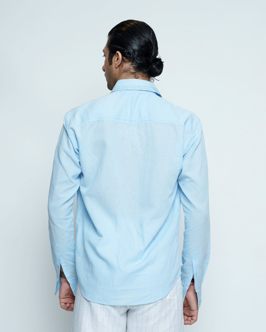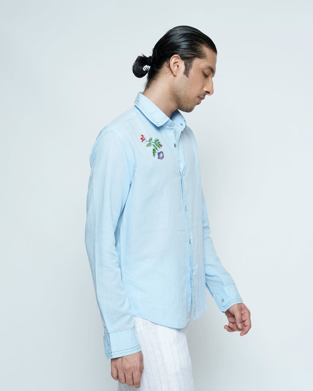 A timeless staple reimagined with a playful twist. This full-sleeve button down shirt is crafted from lightweight cotton linen in a soft powder blue shade. It features a fine contrast stitch detailing along the placket, collar & cuffs finished with a floral bead work embroidery on chest.