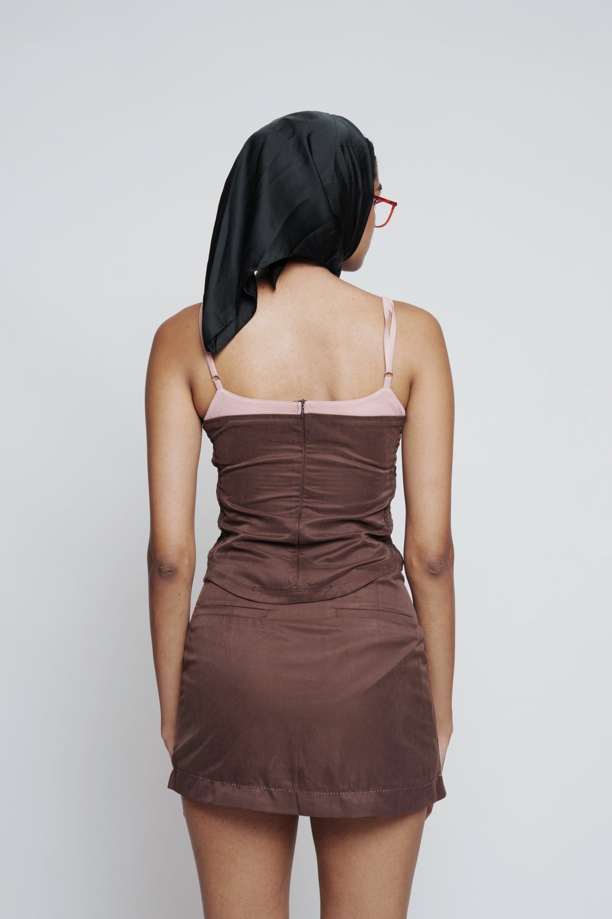 The top is a rich chocolate brown corset style cami, detailed with delicate blush pink dotted stitch across the bust attached with blush pink straps-- a fresh take on contrast paneling. The bodice hugs the waist with a zipper opening in the back.