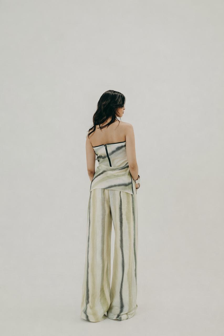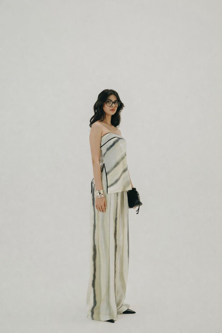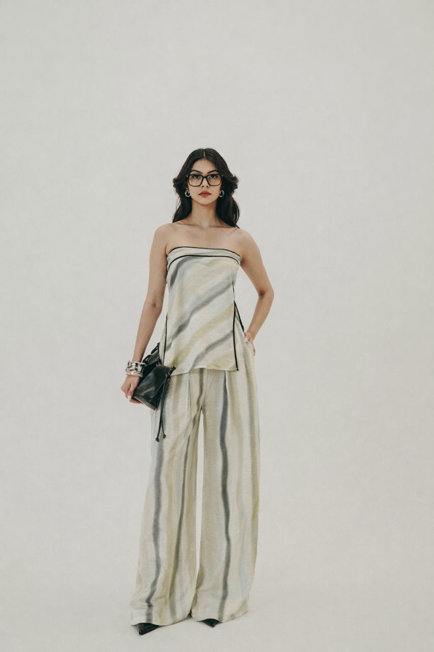 A statement co-ord that moves like water — The Flow Set features a strapless asymmetric top paired with wide-leg pants, both crafted in viscose. The silhouette balances structure and ease, evoking the effortless fluidity of motion. making it perfect for elevated daywear or relaxed evening moments.